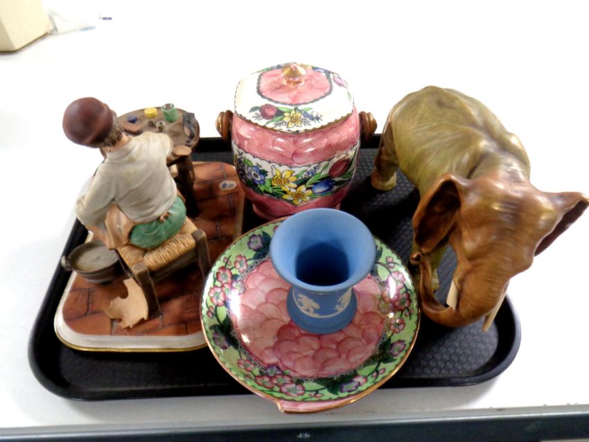 A tray containing assorted ceramics to include Capodimonte figure, The Cobbler, a figure of an elephant (a/f), Wedgwood Jasperware vase together with two pieces of Maling (a/f)
