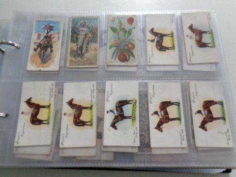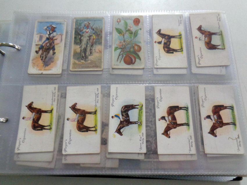 An album containing a large quantity of cigarette cards to include Wills and John Player, anniversary celebration postcards relating to horse racing, association football, household hints, regimental uniforms etc