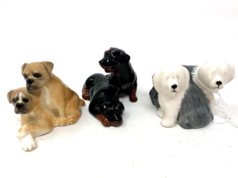 A Beswick china figure : Old English Sheepdogs (Seated), model 3468, grey and white, gloss, height 5 cm, together with two further Beswick china figures - Rottweilers (One Seated, One Lying), model 3490 and Boxers (One Seated, One Lying), model 3475. (3)