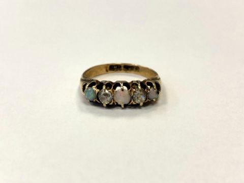 An 18ct gold opal and two stone diamond ring, size I/J, 2.9g.