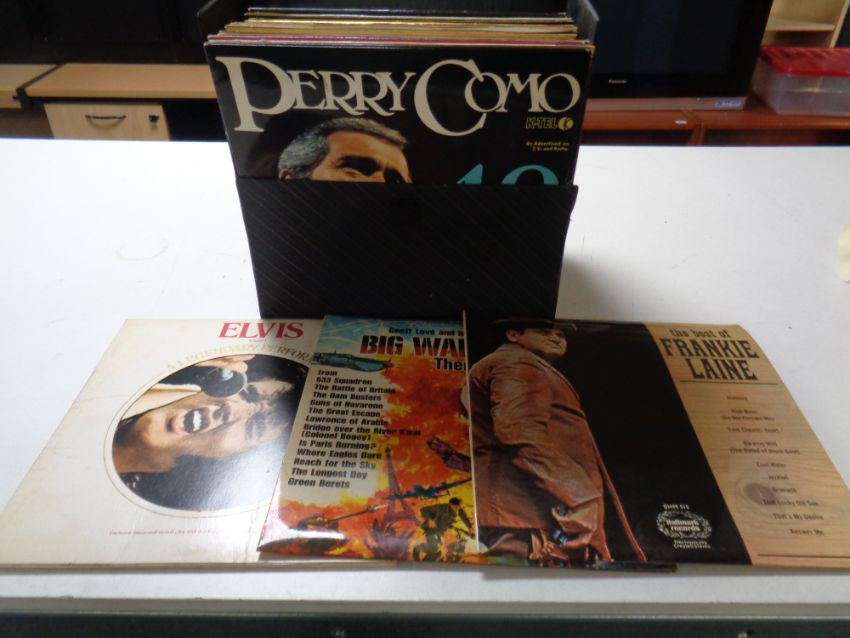 A case containing vinyl LPs to include compilations, easy listening, soundtracks, Elvis etc