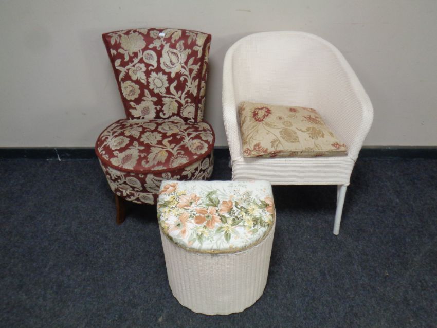 A mid 20th century bedroom chair upholstered in a floral brocade fabric, together with a loom basket chairs and linen box