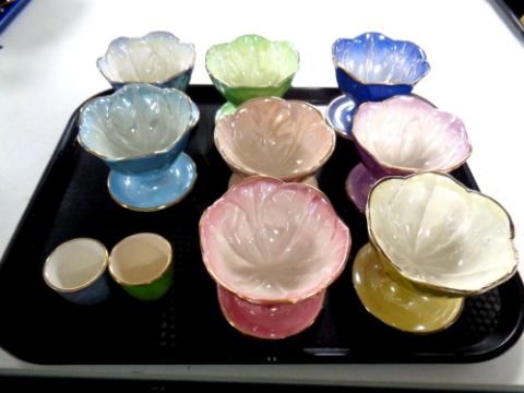 A tray containing eight Maling lustre grapefruit dishes together with two Maling lustre egg cups