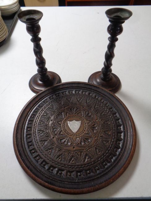 An Edwardian carved oak card tray together with a pair of barley twists candlesticks