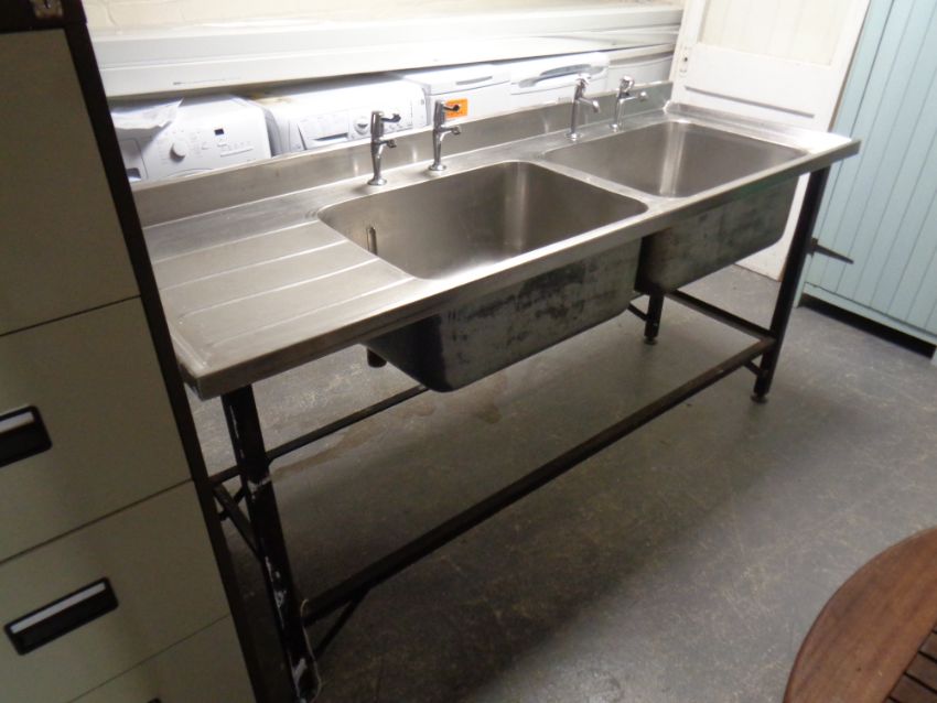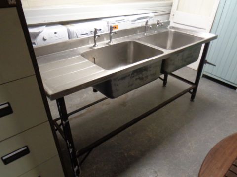 A commercial stainless steel double sink unit with drainer and taps, width 182 cm, depth 65.5 cm