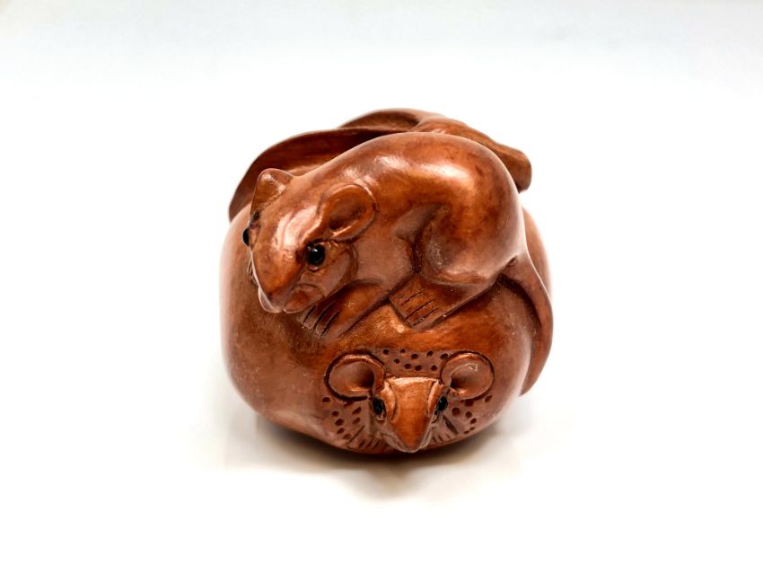 A Japanese carved hardwood netsuke : Rats on Fruit.