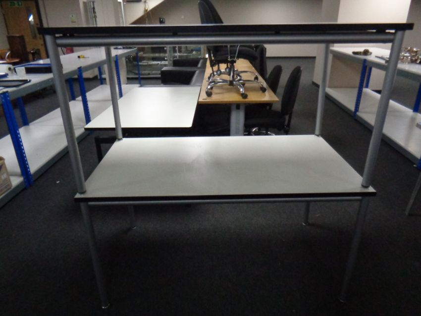 A pair of contemporary office table on tubular metal legs, length 140cm