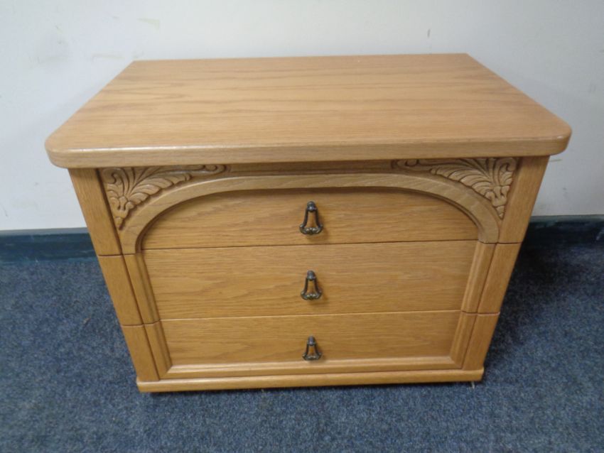 A three drawer bedside chest in oak finish