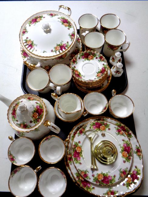 Two trays containing forty pieces of Royal Albert Old Country Roses tea and dinner china