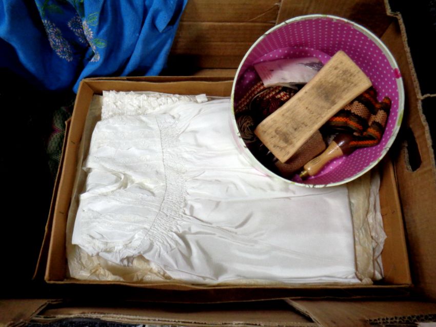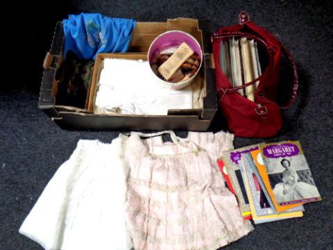 A box of vintage girl's dresses, 20th century purse, sewing items, commemorative books