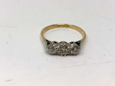 An antique 18ct gold three stone diamond ring, the centre stone approximately 0.5 carat, size Q.