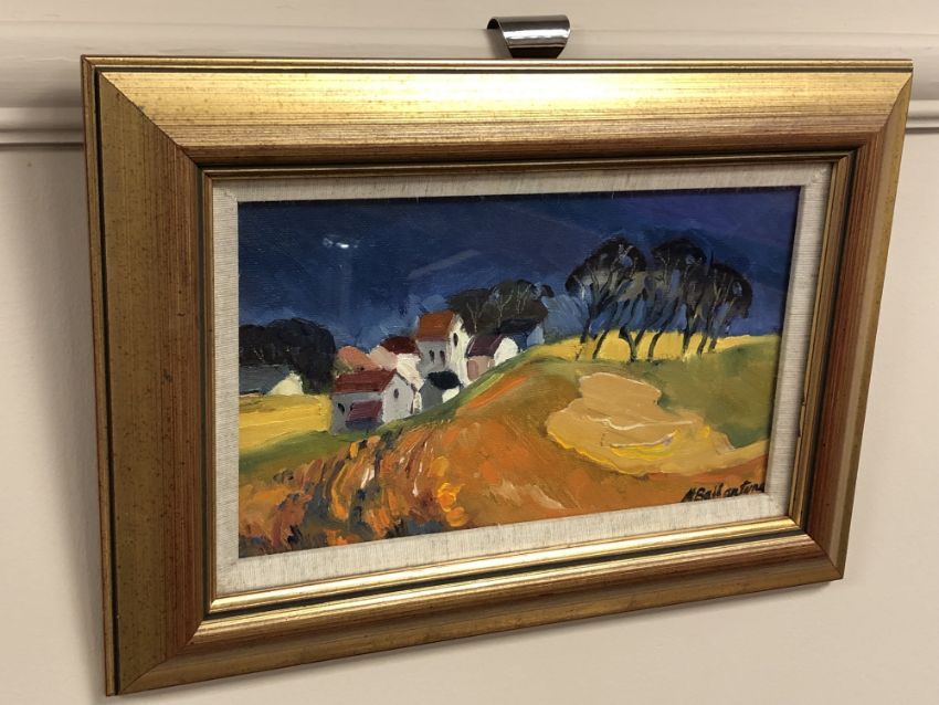 Margaret Ballantyne (Scottish b. 1936) : Renfrewshire landscape, oil on board, 25.5 cm x 15 cm, with Torrance Gallery label verso, dated Xmas '91, also with original receipt from The Torrance Gallery dated 21.12.91.