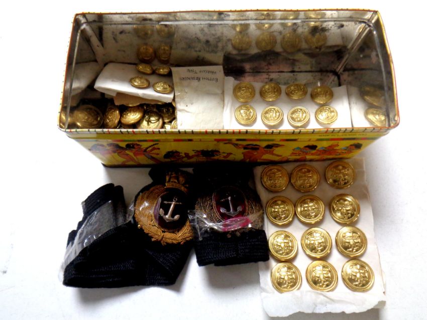 A tin containing naval brass buttons and sew on patches