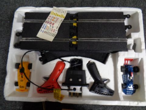 A Scalextric Grand Prix race set in original box together with a wooden model of a pleasure cruiser