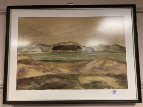 20th century school : Buildings by a hillside, watercolour, 56 x 38 cm