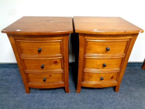 A pair of contemporary pine three drawer bow fronted bedside chests