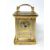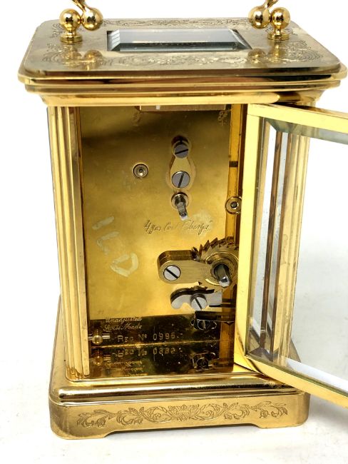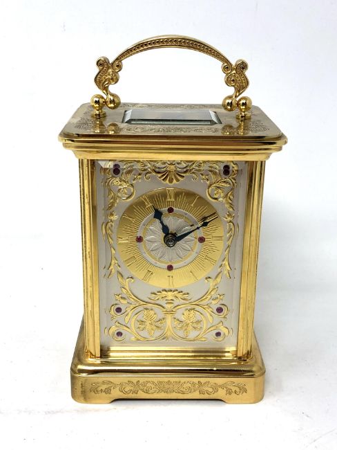 A 20th century Swiss gilt metal cased carriage clock, the movement signed Igor Carl Faberge, Eleven Jewels, Unadjusted, Swiss Made, no. 0995, the case with engraved foliate decoration, with gem-set face and dial, with key, height 14.5 cm including handle.