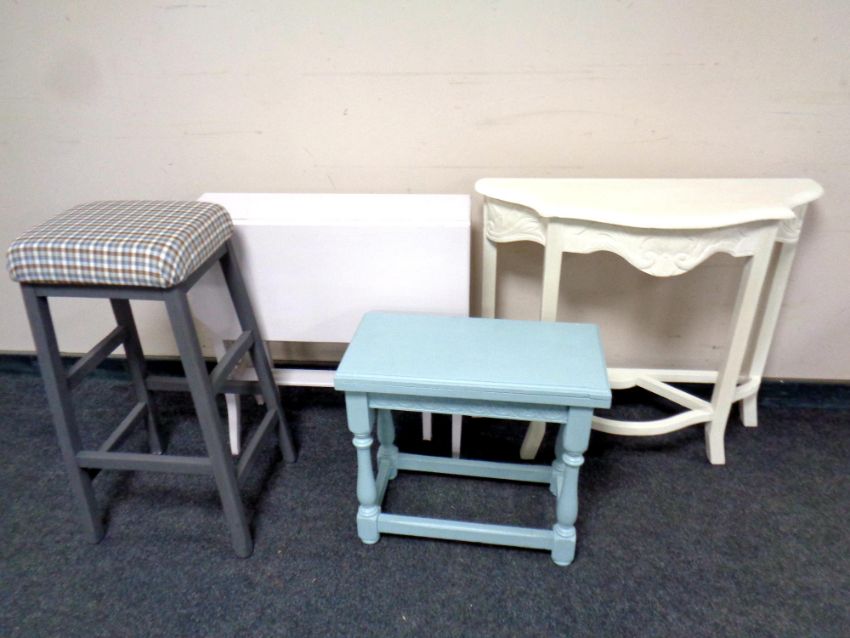 A painted antique Sutherland table together with a painted shaped hall table, occasional table with turnover top and a painted stool