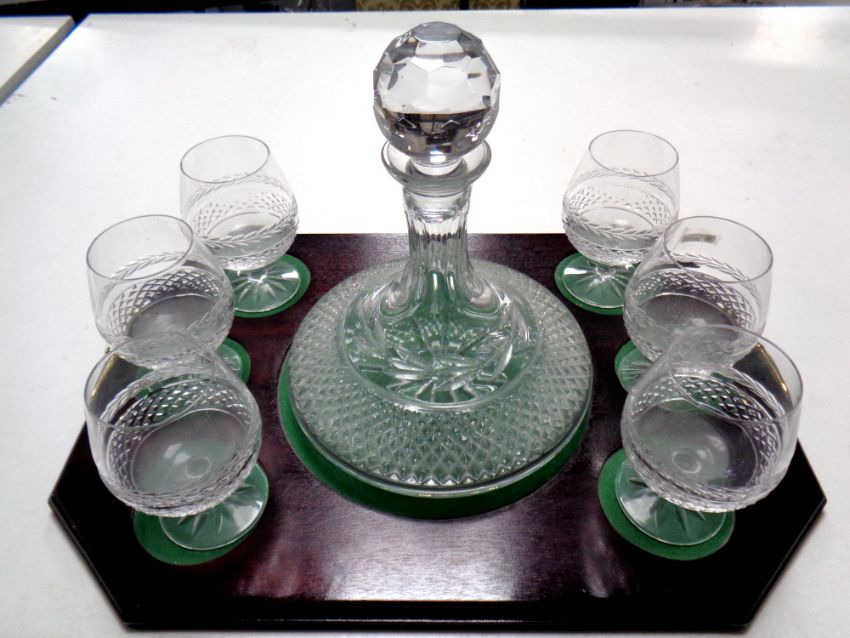 A Galway Crystal decanter with six brandy glasses on a twin handled tray