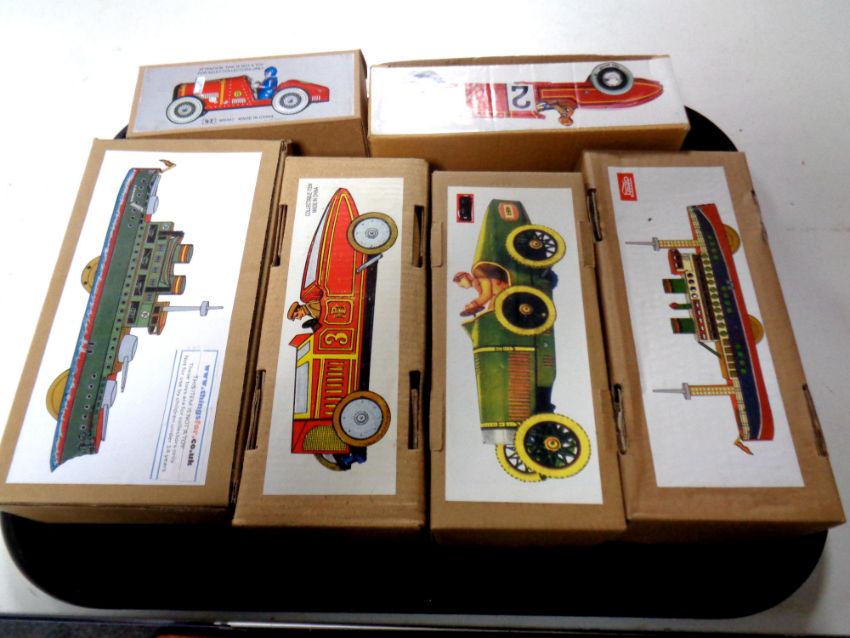 A tray containing retro style wind up tin plate racing cars and boats, boxed (6)