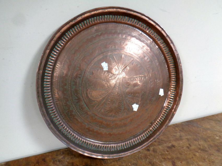 An antique copper Eastern tray, diameter 58 cm and a box of eight further copper trays including Eastern and Art Nouveau examples