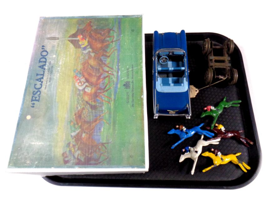 A tray containing a boxed Chad Valley Escalado together with a Danbury Mint die cast car and a set of vintage train wheels