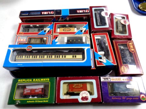 A tray containing Lima, Airfix, GMR and Dapol 00 scale railway coaches and wagons, breakdown cranes etc (13)