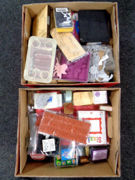 Two boxes containing a large quantity of crafting materials to include stamps, die cutters, ink pads etc