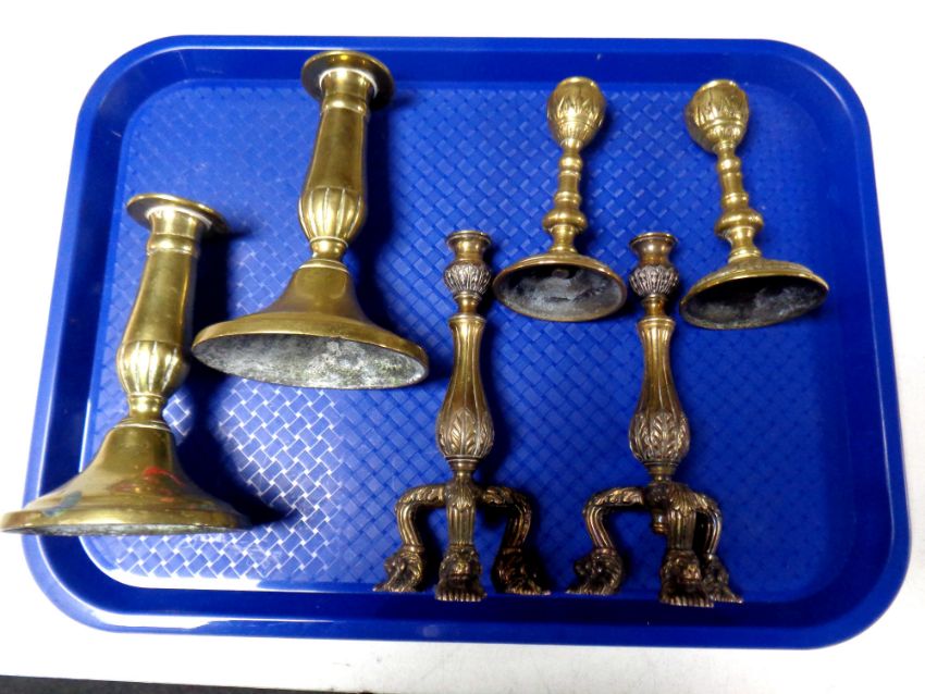 Three pairs of antique brass candlesticks