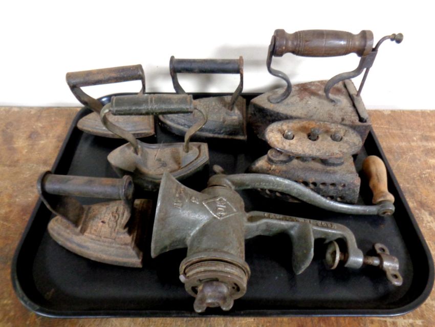 A tray containing seven antique cast iron flat irons together with a vintage mincer