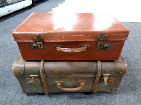 A vintage 20th century leather luggage case together with a bentwood bound trunk