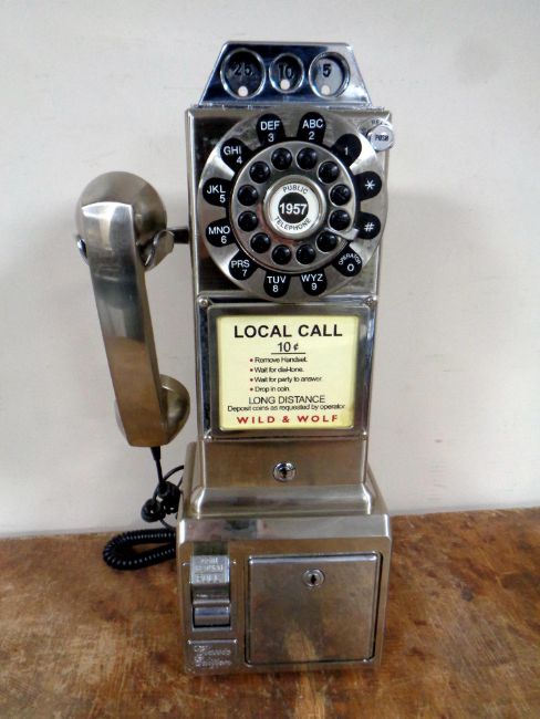 A reproduction telephone in the style of an American 1950s public telephone