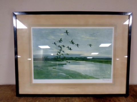 A Peter Scott signed print, Widgeon Beyond the Dunes, dated 1945, in frame and mount, 55 cm x 28.5 cm