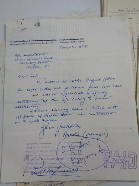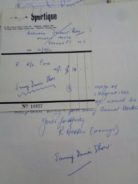 Sammy Davis Jnr 1961 receipts for tailored clothing and time sheets for 'The Sammy Davis Jnr Show' at the Prince of Wales Theatre