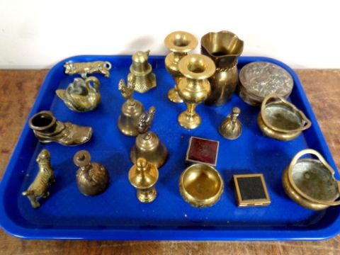 A tray containing assorted brass ware to include a pair of miniature brass censors, brass vases, hand bells, animal ornaments etc