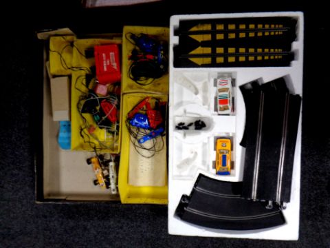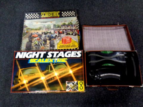Two boxed Scalextric sets, Set 70 and Night Stages (as found) together with a vintage leather case containing a large quantity of Scalextric track