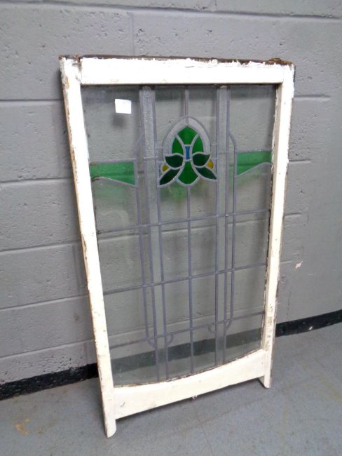 An antique stained glass leaded sash window in frame, height 127 cm width 71 cm