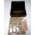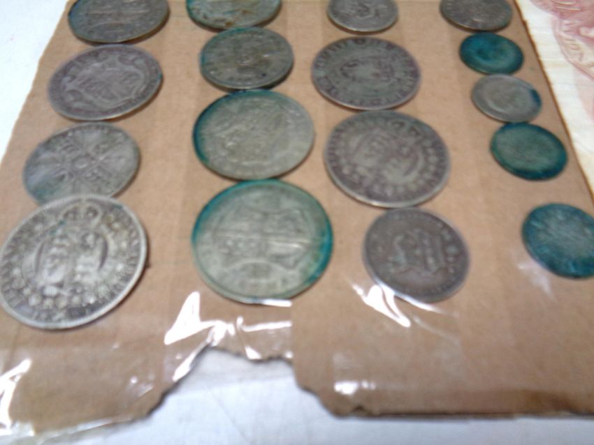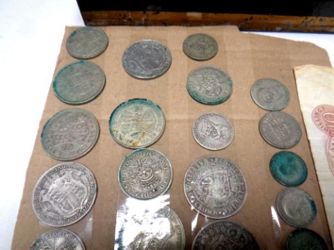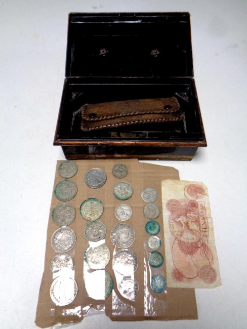 A metal cash box containing leather wallet, Bank of England ten shilling note and a quantity of 19th and 20th century silver coins