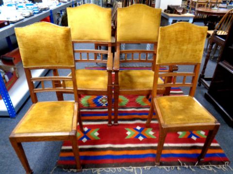 A set of four Edwardian oak chairs comprising of two carvers and two singles upholstered in a gold dralon