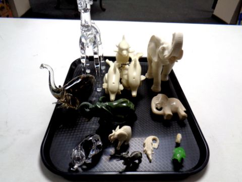 A tray containing assorted glass, plastic, resin and polished stone animal figures