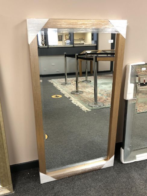 A contemporary bevelled mirror in a copper effect frame, 71 x 131 cm