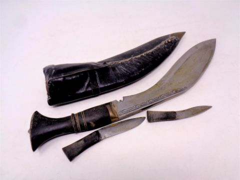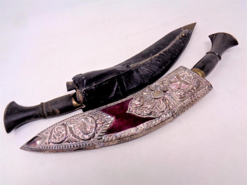 Two kukri knives, one in ornate white metal sheath