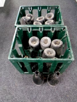 Two plastic brewery crates containing twelve vintage green glass wine bottles