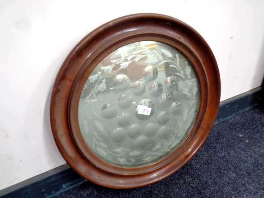 A circular Edwardian etched mirror in a mahogany frame, diameter 49.5 cm