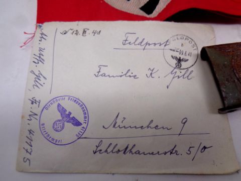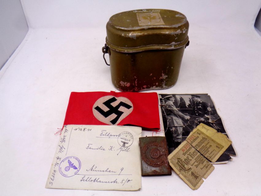 A collection of German Nazi items to include metal canteen, belt buckle, swastika arm band, monochrome photograph of Hitler etc