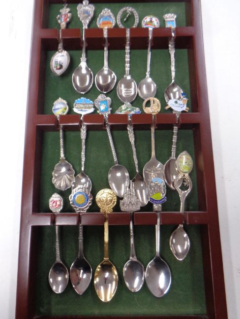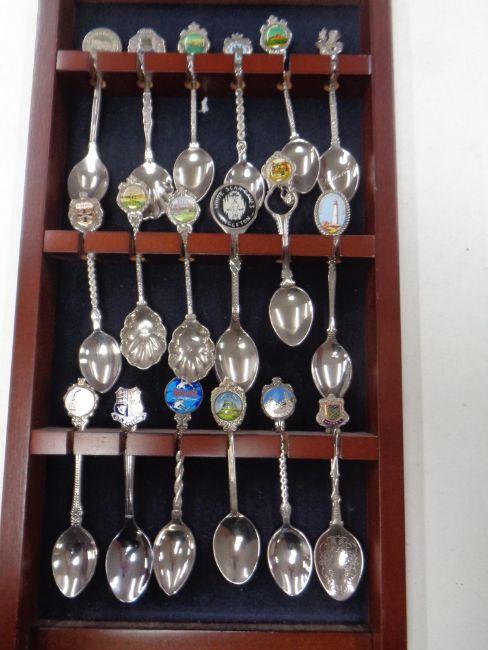 A large quantity of collector's spoons on seven wall racks to include commemorative, tourist and souvenir examples.