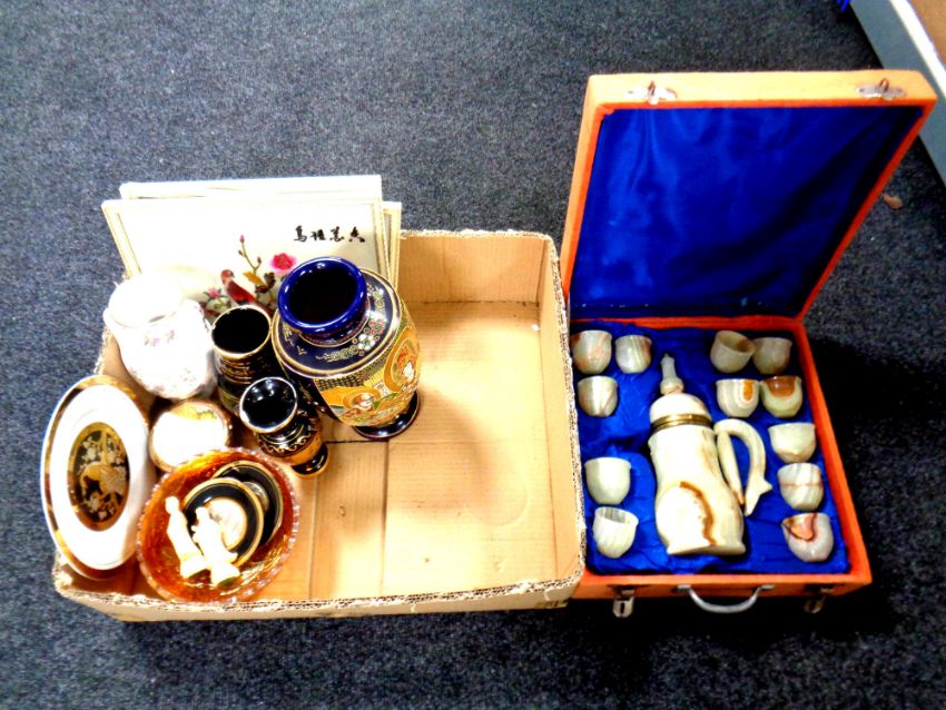 A box containing cased onyx eastern coffee set (as found), Japanese vase, framed needlework panels, carnival glass bowl etc