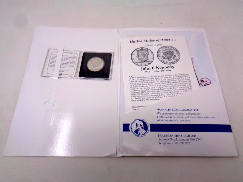 A Franklin Mint John F Kennedy 1964 silver half dollar with certificate in folder together with a case containing a silver handled knife and a silver fork