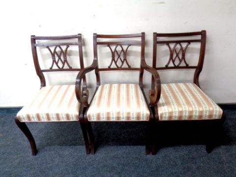 An eleven piece Regency style dining room suite : serpentine fronted sideboard, bookcase fitted cupboards, pedestal extending table and eight chairs
