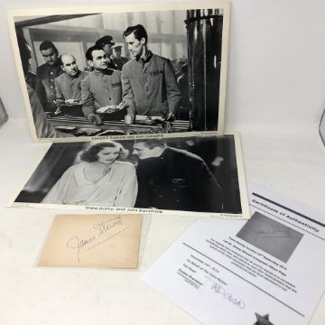 A James Stewart autograph with coa, and vintage cinema cards of Greta Garbo and John Barrymore (From the 1932 film Grand Hotel), and Edward G Robinson & John Carradine (From the 1937 film 'The Last Gangster), 17x11 inches.